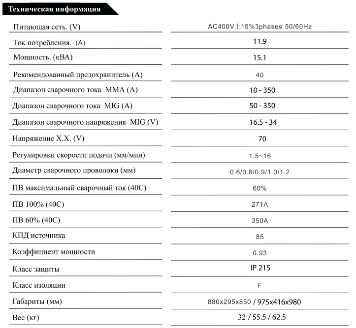 - Сила тока: 350А